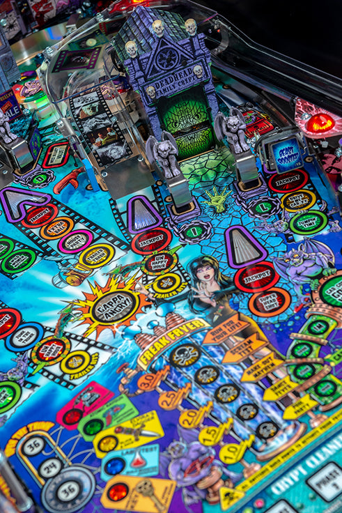 Wenn eine spukartige Villa nicht ausreichte, um Ihre Haut zum Krabbeln zu bringen, hüten Sie sich vor der "Deadhead Family Crypt"! Dieses Mausoleum beherbergt eine Vielzahl von Charakteren, die eine Erwachensfertigkeit einer stahlen Silberkugel zu ihrem Kopf brauchen. Diese interaktive Krypta hält die Spieler auf den Zehenspitzen, wobei der Crypt-Eingang Bälle von einem separaten Ort aus entfesselt und gleichzeitig zu einem physischen Bash-Spielzeug wird. Und mit Elviras ausstehendem Zug von ihrem hoffnungsvollen Hausverkauf ermöglicht das interaktive Elvira-Spielzeug „Junk in the Trunk“ den Spielern, Bälle für einen hektischen Zwei-Ball-Multiball zu sperren.