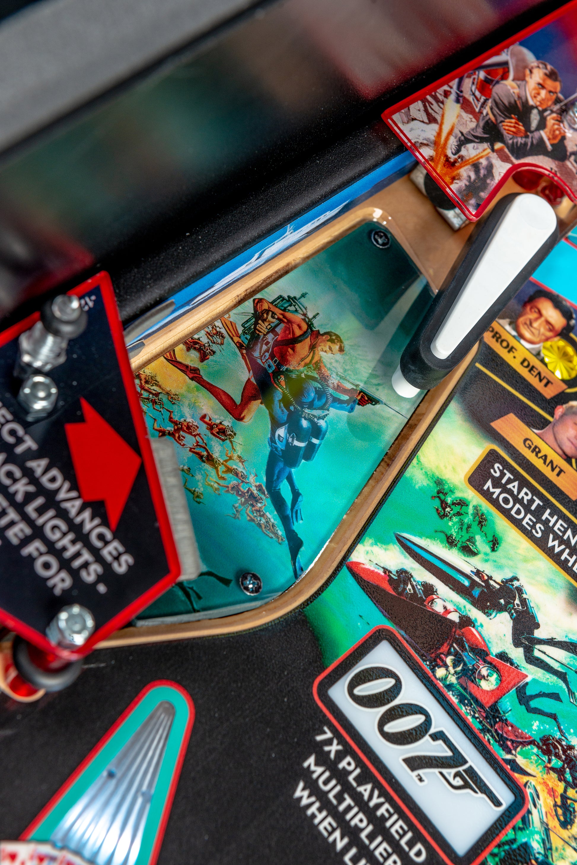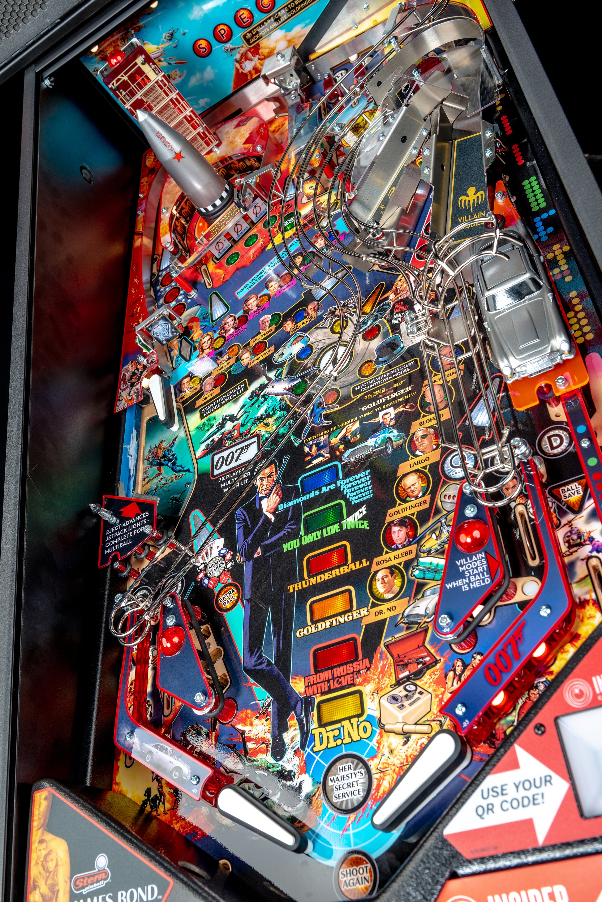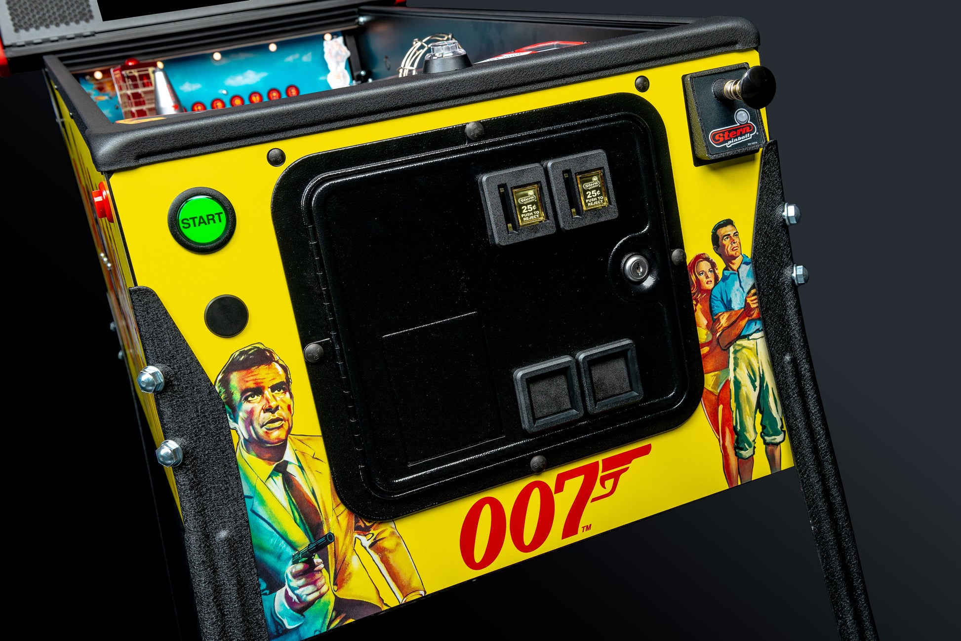 Sterns James Bond 007 Eckstein-Flippermaschine wird Filmmaterial und ikonische Musik aus den Filmen hervorheben, die die 007-Legende gebaut haben: Dr. Nein, aus Russland mit Liebe (1963), Goldfinger (1964), Thunderball (1965), You Only Live Twice (1967) und Diamonds Are Forever (1971). Die Spieler sind in dieser actionreichen Flipper-Erfahrung in die Welt der Spionage eingetaucht, erledigen Aufgaben, arbeiten mit wichtigen Verbündeten zusammen und stoppen die schurkischen Pläne von SPECTRE.