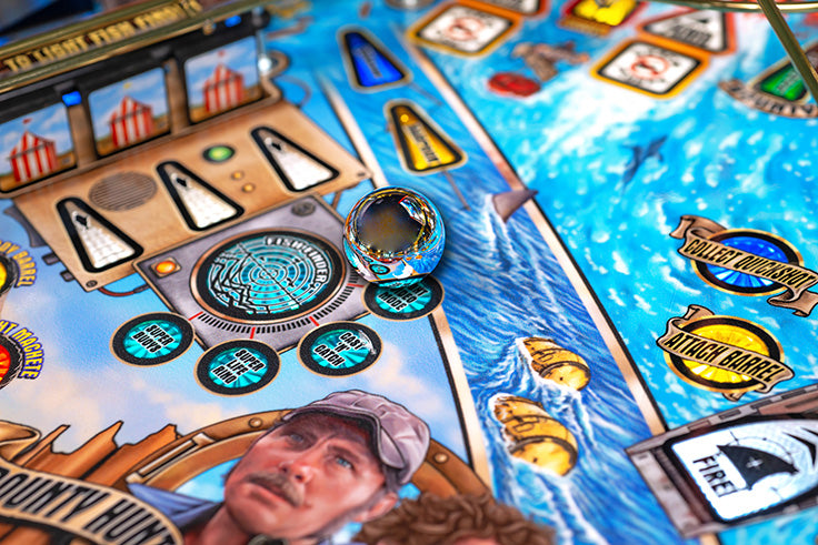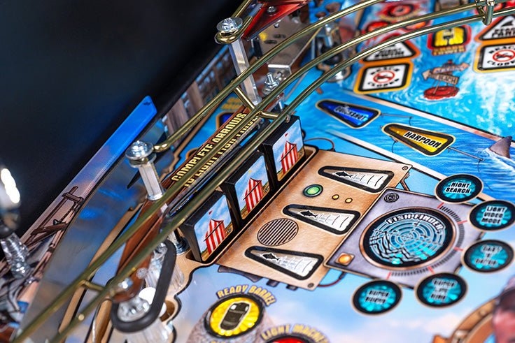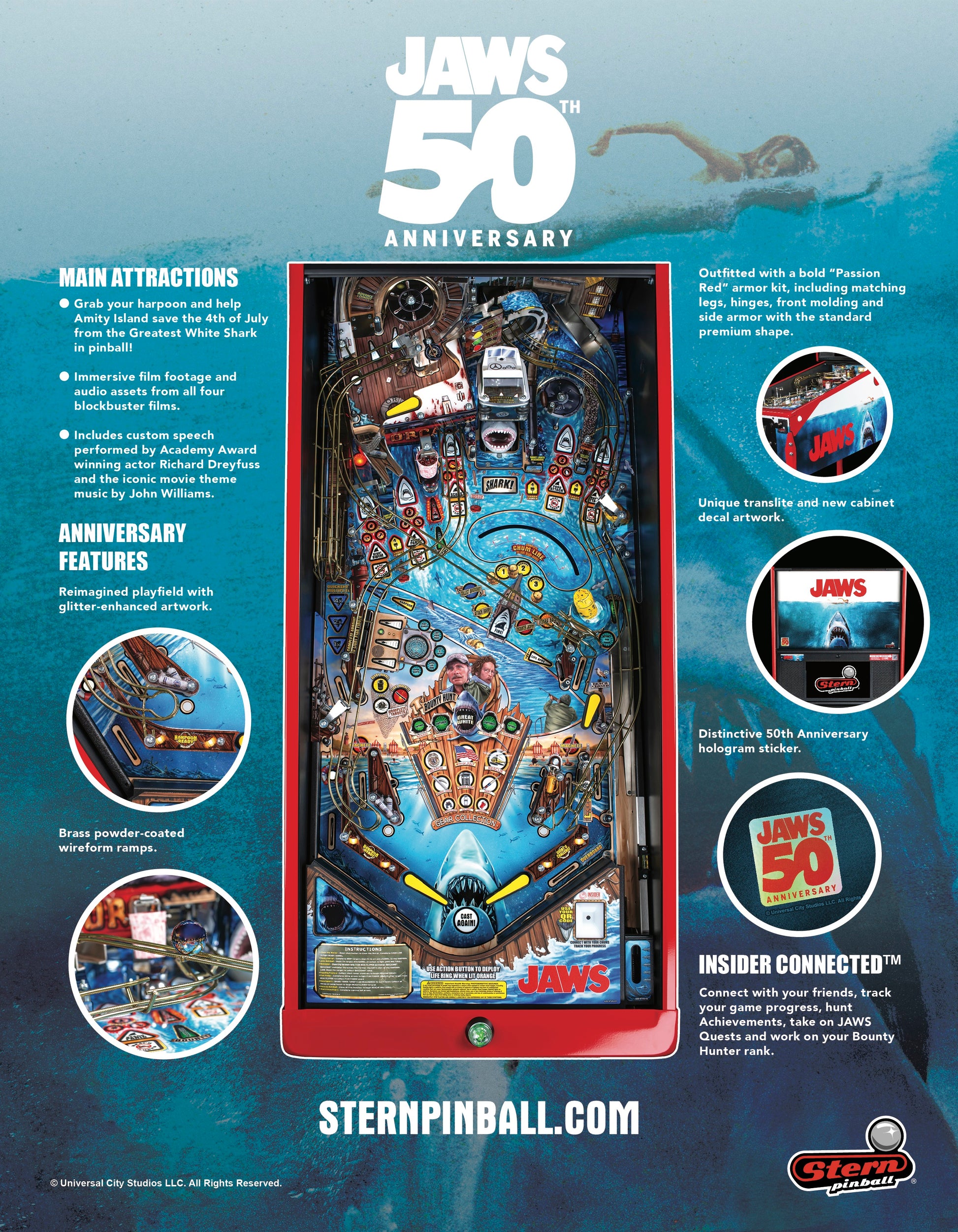 Anlässlich dieses goldenen Jubiläums hat das Stern-Team eine epische Version seines beliebten JawsKiefer-Flippenautomaten entwickelt. Die JAWS 50th Anniversary Premium Edition verfügt über ein neu gestaltetes Spielfeld mit glitzerverstärktem Kunstwerk und pulverbeschichteten Drahtform-Rampen aus Messing. Dieses Sammlerstück verfügt auch über einen unverwechselbaren 50th Anniversary Hologramm-Aufkleber zusammen mit einem einzigartigen Translite und Schrank-Abziehbilder. Der Flipperautomat ist mit einem auffälligen „Blood Red“ Rüstungskit ausgestattet, das passende Beine, Scharniere, Frontform und Seitenrüstung mit Standard-Premiumform umfasst.